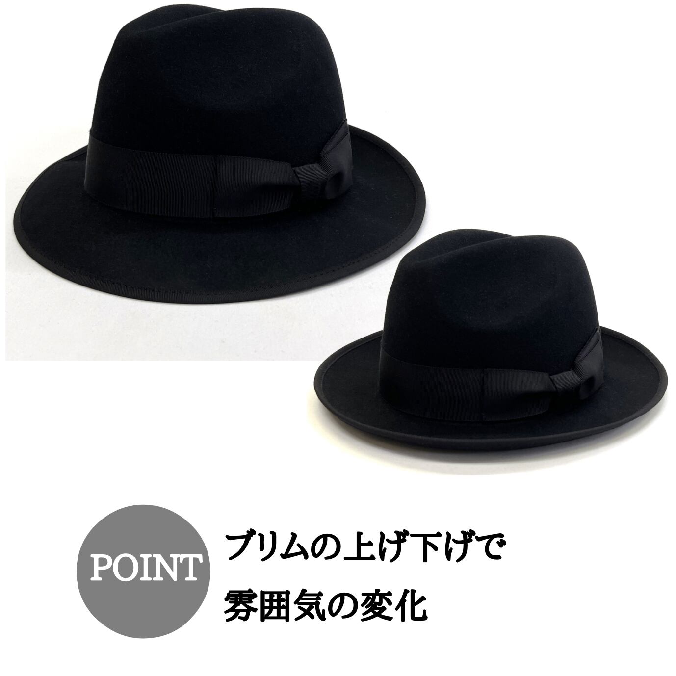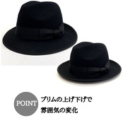ブリムの角度で雰囲気が変わります。