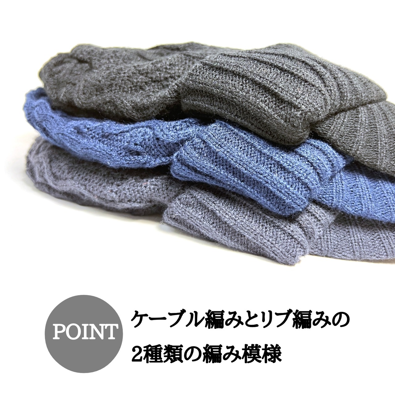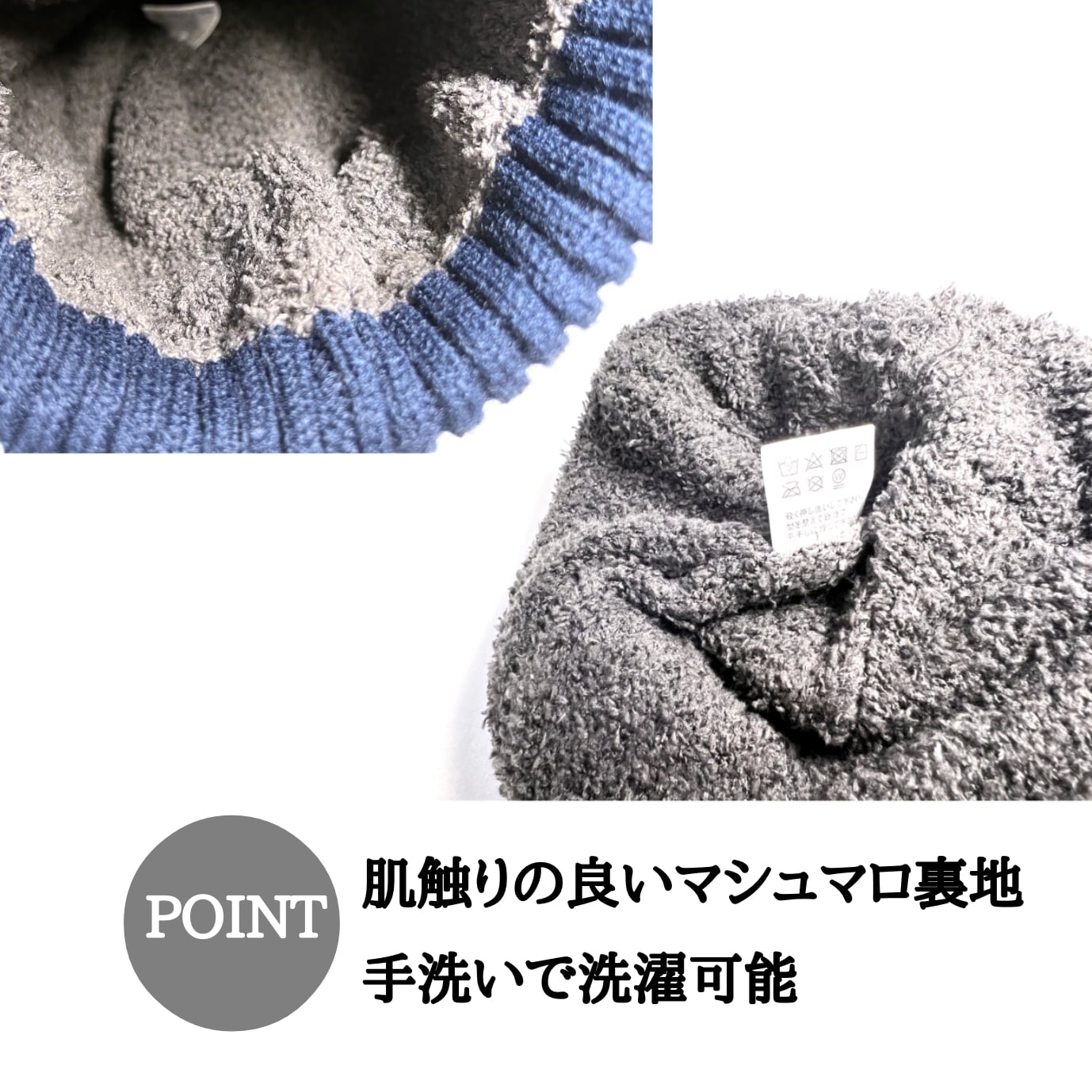 表地は肉厚なアクリルを使用。肌に触る内側はマシュマロのようなふわふわニットを使用しています。